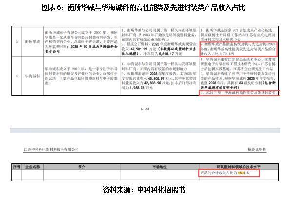 招股书还显示,2024年,衡所华威高性能类及先进封装类产品的合计收入占比为72.18%;同年,华海诚科高性能类及先进封装类产品的合计收入占比为48.41%。