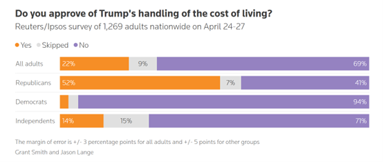 尽管71%的共和党人仍表示支持特朗普,但该党有41%的人表示不赞成他对生活成本的处理方式。