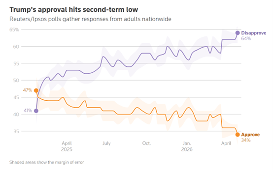 这项为期四天的美国全国调查显示,仅有34%的美国人认可特朗普的执政表现,较4月中旬36%的支持率进一步下滑,也明显低于其2025年1月上任时47%的支持率。