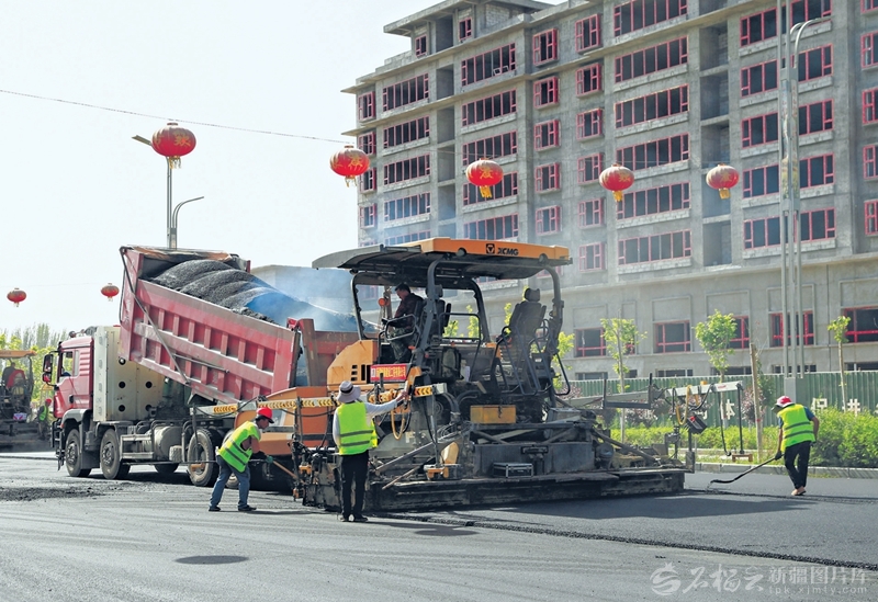 4月26日,在阿瓦提县阿瓦提镇锦绣社区民生南路,工人们在铺设沥青路面。阿瓦提县紧盯民生诉求,针对民生南路路面破损坑洼、通行不畅等问题,及时开展沥青铺设与道路修缮,优化通行环境。□包良廷摄