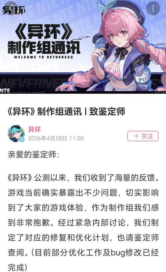 4月28日,A股游戏公司完美世界股份有限公司(002624 SZ,以下简称“完美世界”)旗下新游戏《异环》发布制作组通讯公告,针对公测以来出现的性能优化、BUG等问题向玩家致歉,并宣布公布了玩家补偿、性能优化、BUG修复及云游戏上线等多项改进计划。