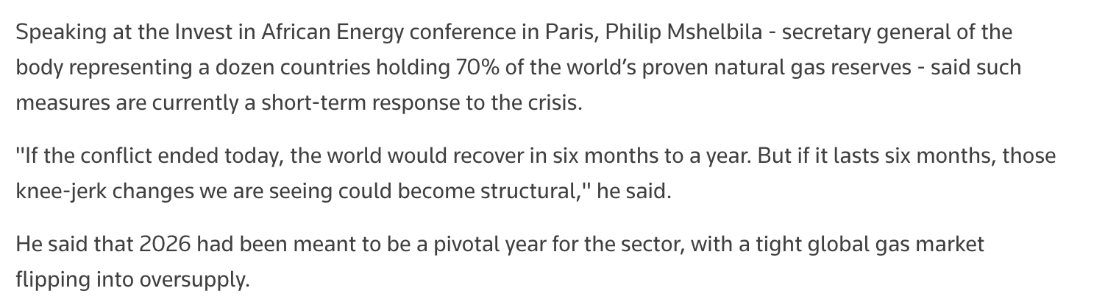 据路透社报道,天然气出口国论坛(GECF)秘书长此前表示,即便战事迅速落幕,天然气出口恢复也需耗时数月;若冲突持续发酵,供应中断的负面影响或可能会演变成结构性变化。GECF警示,短期的供应紧张和需求调整,可能因冲突延长而变成常态。至于原本预期的供应过剩局面,目前尚不确定是会推迟,还是彻底落空。