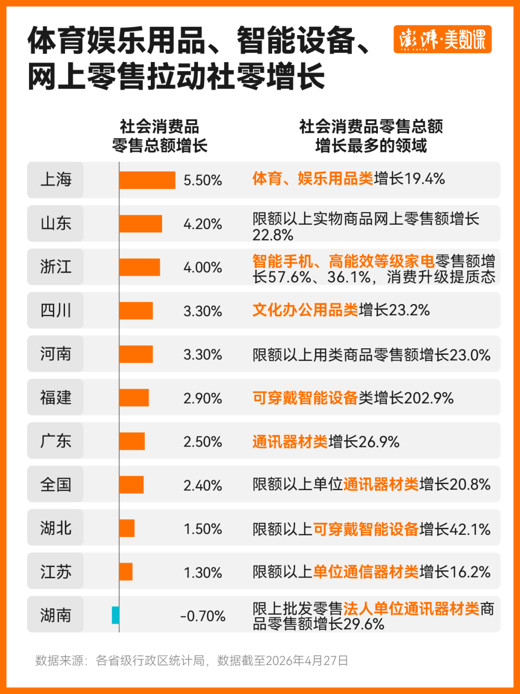 从经济大省的数据可以看到,拉动消费增长的动力主要来自体育娱乐用品、智能设备、网上零售。比如,上海一季度体育、娱乐用品类零售额增长19.4%,浙江一季度智能手机、高能效等级家电零售额增长57.6%、36.1%,福建一季度可穿戴智能设备类零售额增长202.9%。