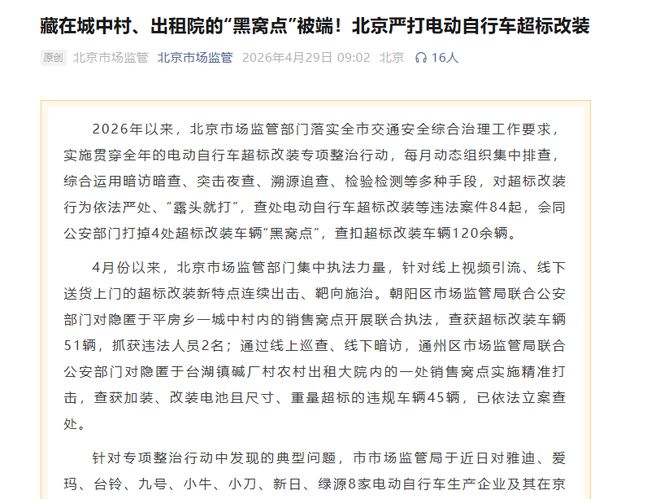 据了解,北京市市场监管局明确了“两落实、五严禁”要求。即严格落实质量安全主体责任,严格落实强制性产品认证规定;严禁生产销售车辆与认证样品不一致,严禁预留改装空间,严禁销售未经认证车辆,严禁销售不合格车辆,严禁加装改装电动自行车,切实保障消费者出行安全。