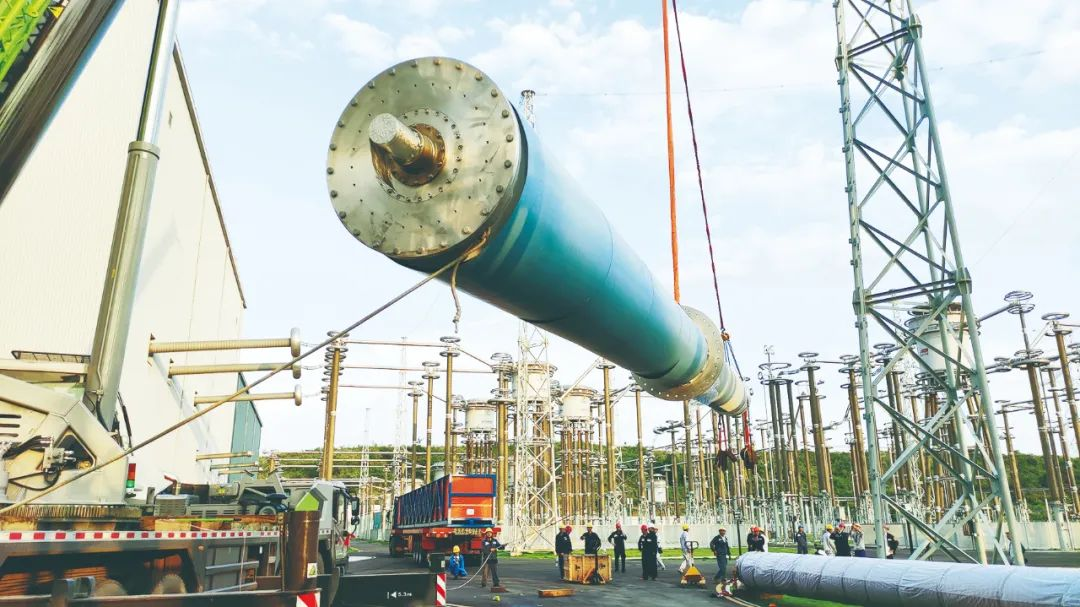 ▲图为2021年5月21日,南方电网牵头自主研制的首支800千伏柔直穿墙套管安装现场。李品/摄