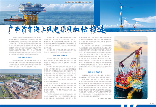 在项目建设过程中,广西投资集团针对北部湾海域特性,与广西大学等高校联合进行科技创新项目研究,开展了《超薄覆盖层基岩海床面海缆敷设施工及保护技术研究》等9个科研课题,筹办成立广西首个海上风电院士工作站。