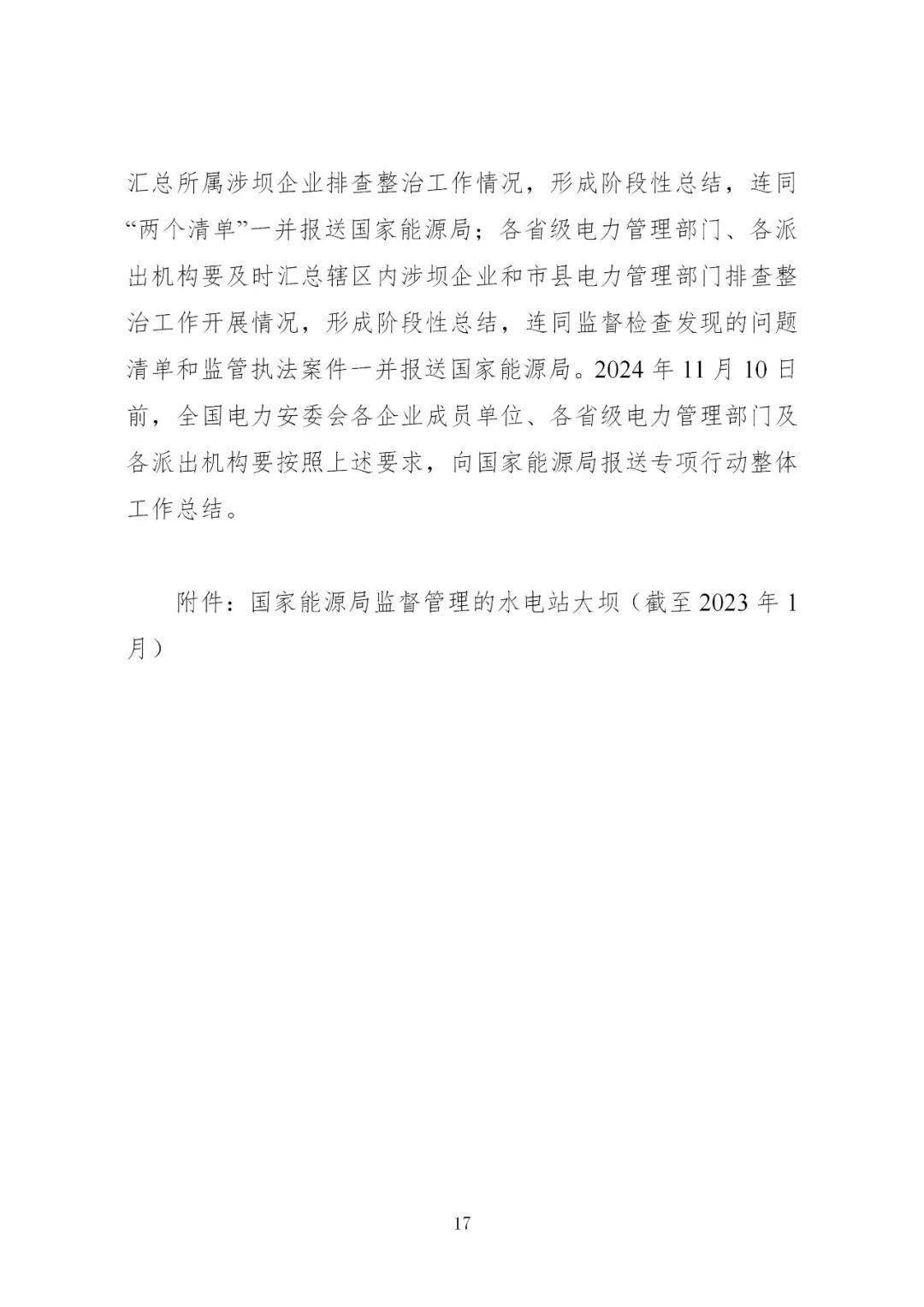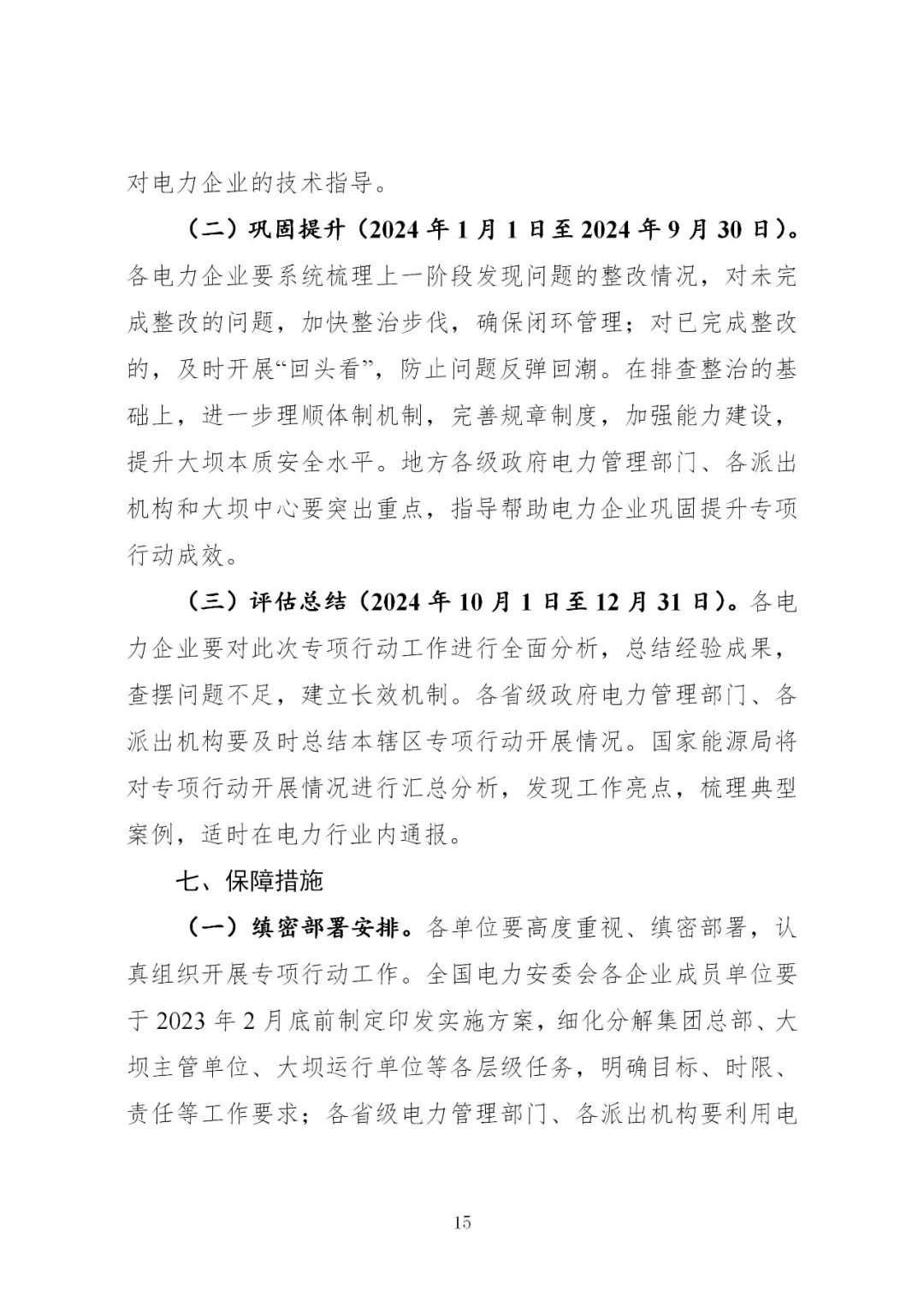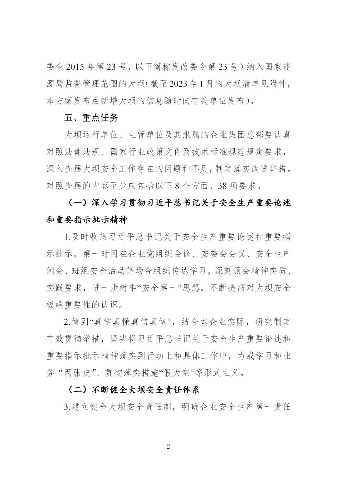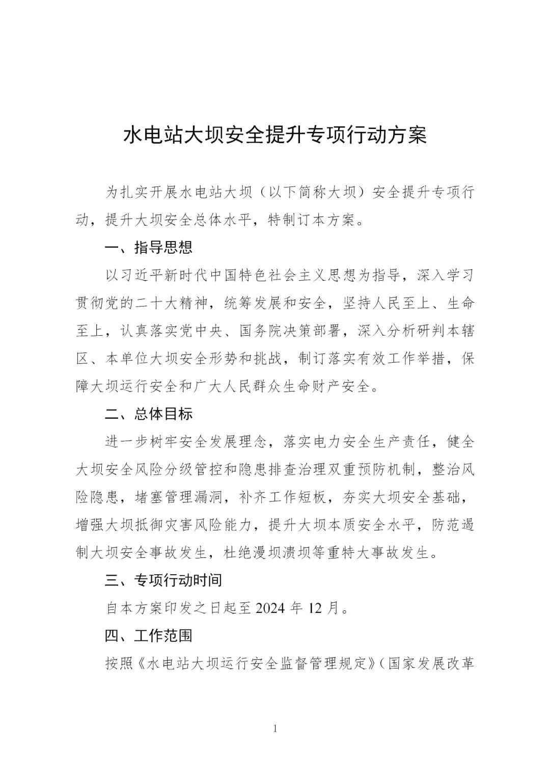 各省(自治区、直辖市)能源局,有关省(自治区、直辖市)及新疆生产建设兵团发展改革委、工业和信息化主管部门,北京市城市管理委,各派出机构,大坝中心,全国电力安委会各企业成员单位,有关单位:为进一步加强水电站大坝(以下简称大坝)安全监督管理,深入排查整治大坝安全问题,有效提升大坝安全总体水平,我局决定在全国范围内组织开展大坝安全提升专项行动。现将行动方案印发给你们,请认真抓好贯彻落实,按时高质量完成各项工作任务。