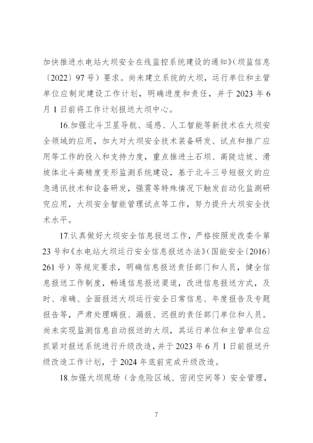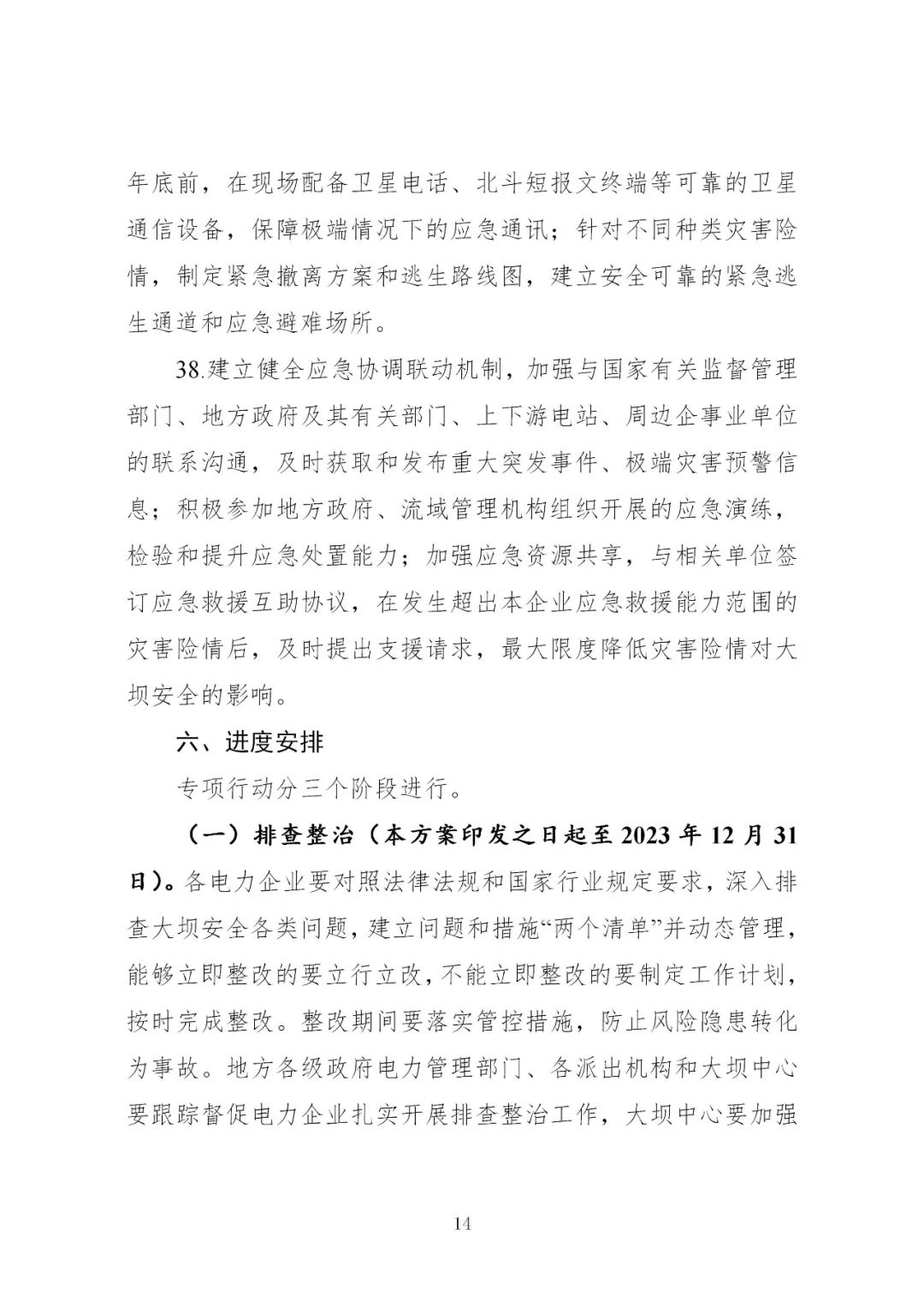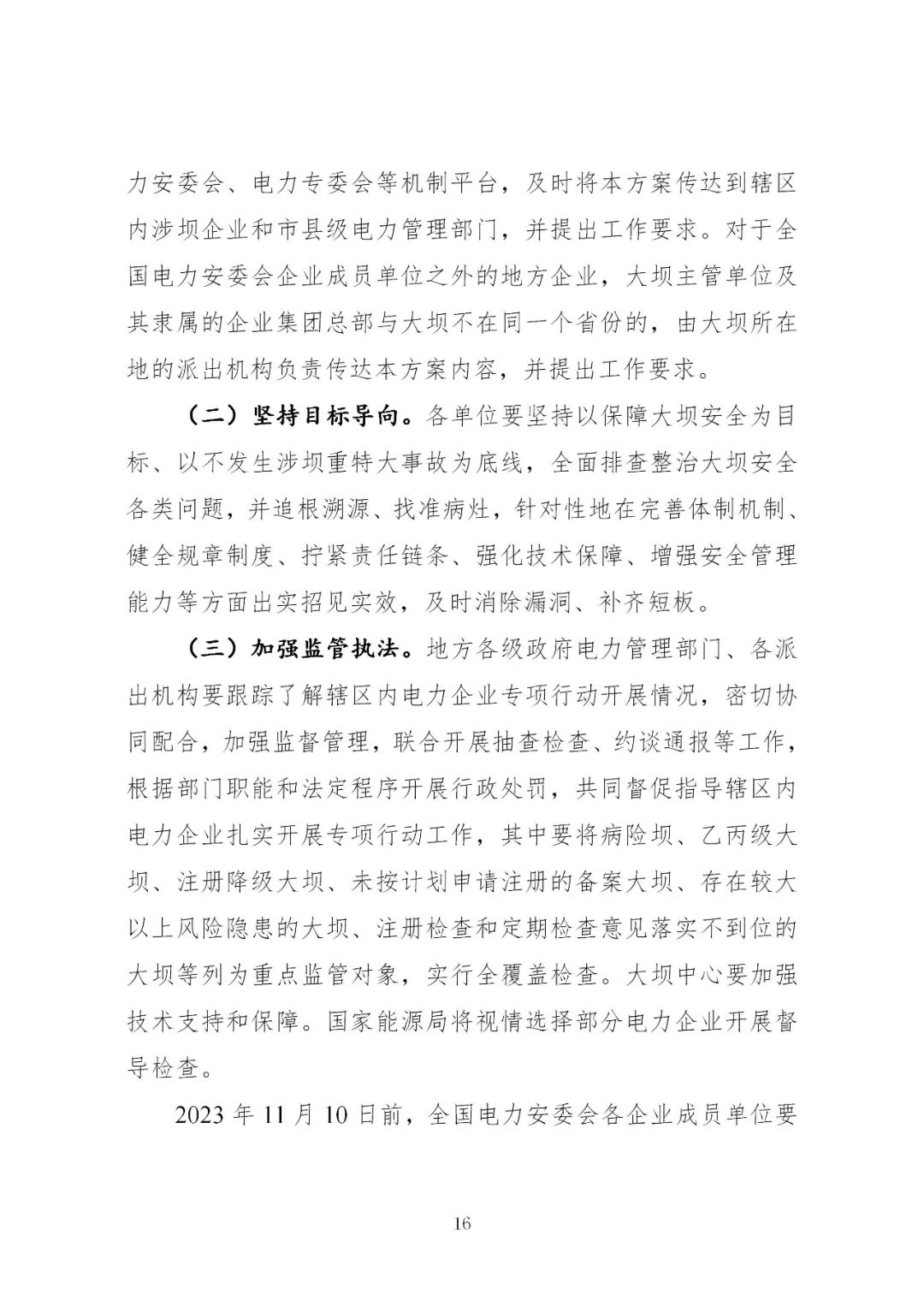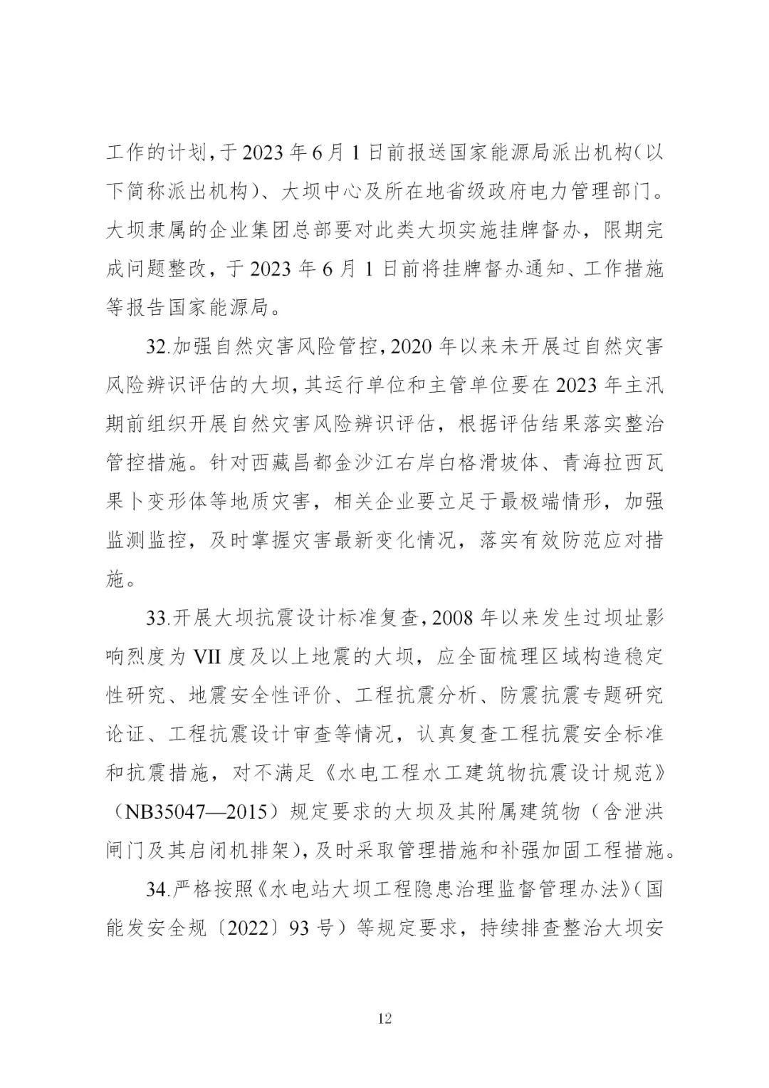 各省(自治区、直辖市)能源局,有关省(自治区、直辖市)及新疆生产建设兵团发展改革委、工业和信息化主管部门,北京市城市管理委,各派出机构,大坝中心,全国电力安委会各企业成员单位,有关单位:为进一步加强水电站大坝(以下简称大坝)安全监督管理,深入排查整治大坝安全问题,有效提升大坝安全总体水平,我局决定在全国范围内组织开展大坝安全提升专项行动。现将行动方案印发给你们,请认真抓好贯彻落实,按时高质量完成各项工作任务。