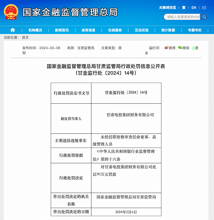 2月8日,国家金融监督管理总局甘肃监管局行政处罚信息公开表显示,甘肃电投集团财务有限公司因未经任职资格审查任命董事、高级管理人员,被罚款90万元。