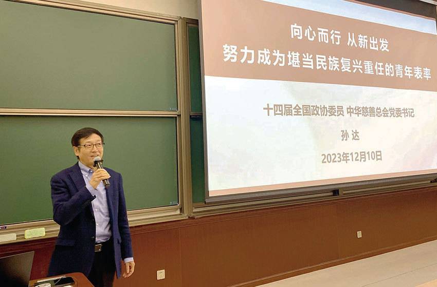 —— 第十四届全国政协委员、中华慈善总会党委书记孙达在清华大学为新生入党积极分子讲授党课受到欢迎