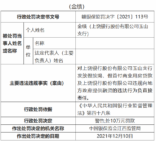 上饶银行玉山支行的金绩对上饶银行股份有限公司玉山支行发放假按揭、假首付商业用房贷款及上饶银行股份有限公司违规向地方政府提供融资的违法行为负直接责任,受到警告,并处10万元罚款。
