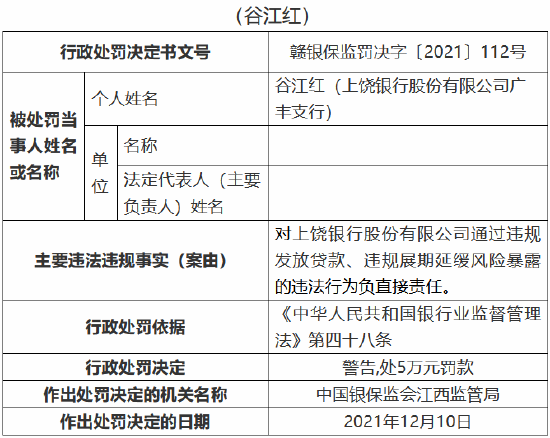 时任员工谷江红对上饶银行股份有限公司通过违规发放贷款、违规展期延缓风险暴露的违法行为负直接责任,受到警告,并处5万元罚款。