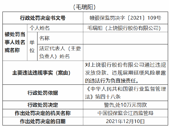 时任员工毛瑞阳对上饶银行股份有限公司通过违规发放贷款、违规展期延缓风险暴露的违法行为负直接责任,受到警告,并处10万元罚款。