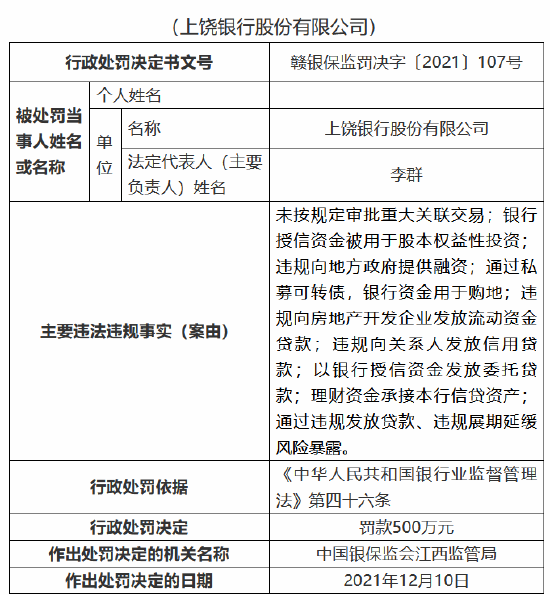 12月14日,国家金融监督管理总局披露多张上饶银行罚单。中国银保监会江西监管局2021年第107号行政处罚信息公开表显示,上饶银行因以下九项主要违法违规事实,被罚款500万元。此外,还有6名相关员工被罚,共计被罚45万元。