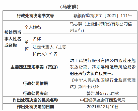 时任员工马志群对上饶银行股份有限公司通过违规发放贷款、违规展期延缓风险暴露的违法行为负直接责任,受到警告,并处5万元罚款。