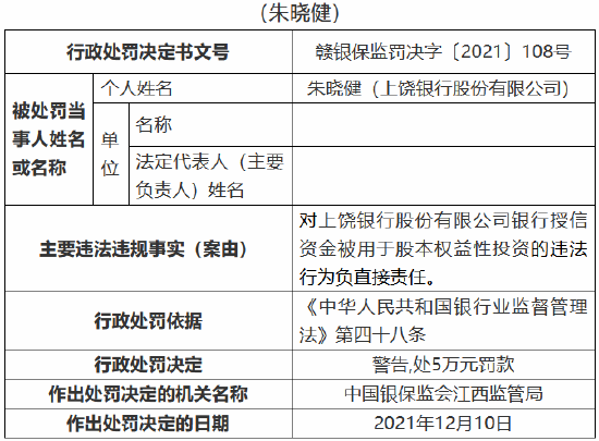 时任员工朱晓健对上饶银行股份有限公司银行授信资金被用于股本权益性投资的违法行为负直接责任,受到警告,并处5万元罚款。