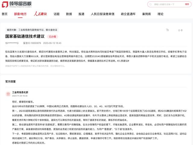 近日,工信部在人民网领导留言板就用户关心的2G/3G退网相关问题进行了回复。工信部表示,2G/3G退网是移动通信网更新换代的必然选择,也是当前国际上的主要做法。但移动通信退网不是简单地“说退就退”。需要完善用户保障措施,在充分保障用户权益前提下,才能实施退网。