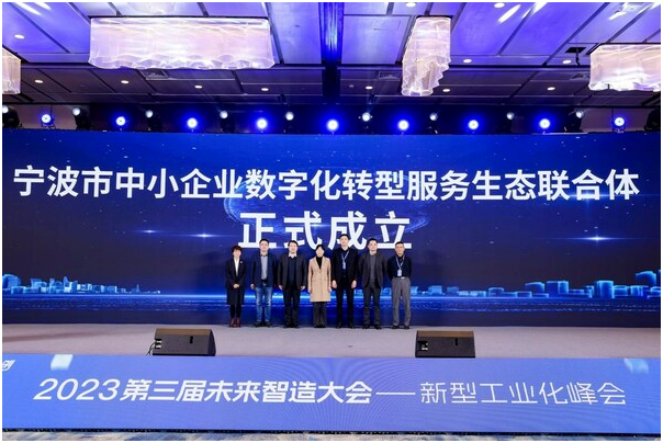 大会成立了宁波市中小企业数字化转型服务生态联合体。该联合体由宁波市数字经济局、工业互联网平台、智能制造领域优秀服务资源、系统集成商、金融服务机构、以及来自各地、各领域拥有数字化转型成功经验的的企业家联合成立,以宁波入选工信部第一批中小企业数字化转型试点城市为契机,协同政产学研用金六端优势互补,跨界融合,遵循"1+1+N+X"生态型数智化"宁波范式",打造出一个可面向全国中小企业复制推广的"全国标准",从而全面提升中小企业数字化水平。