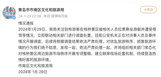 1月29日,青岛市南区文化和旅游局就网传“女子在青岛栈桥不坐游艇被骂穷光蛋”发布情况通报称,关注到有游客在栈桥景区被相关人员拉票乘坐游艇并遭受辱骂等情况,立即联动相关部门进行调查处置。目前公安机关正在对涉事人员及事件情况开展调查,后续将根据调查结果依法严肃处理。