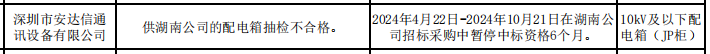 其中,深圳市安达信通讯设备有限公司因在供湖南公司的配电箱抽检不合格,暂停中标资格6个月。处理措施:2024年4月22日-2024年10月21日在湖南公 司招标采购中暂停中标资格6个月。处理范围:10kV及以下配 电箱(JP柜)。