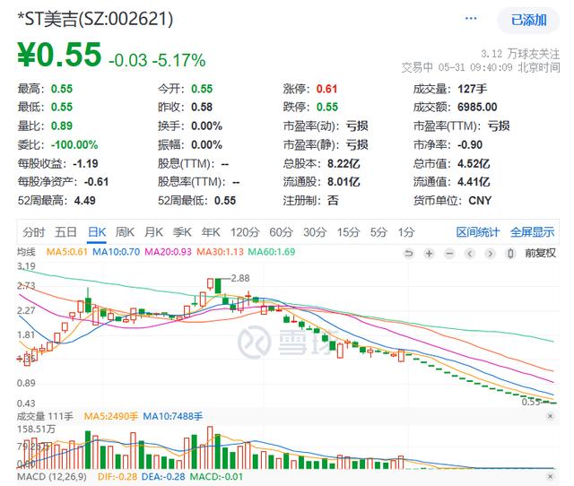 截至5月31日,美吉姆股价一度下跌5.17%,报0.55元/股,创其股价历史新低。