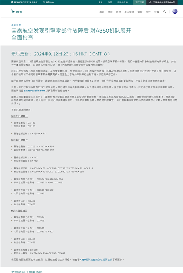 国泰航空9月2日晚发布通报,当日凌晨前往苏黎世的CX383航班折返香港,经检查该空客A350飞机后,发现引擎零部件故障,这次A350飞机引擎零部件故障为全球首例。