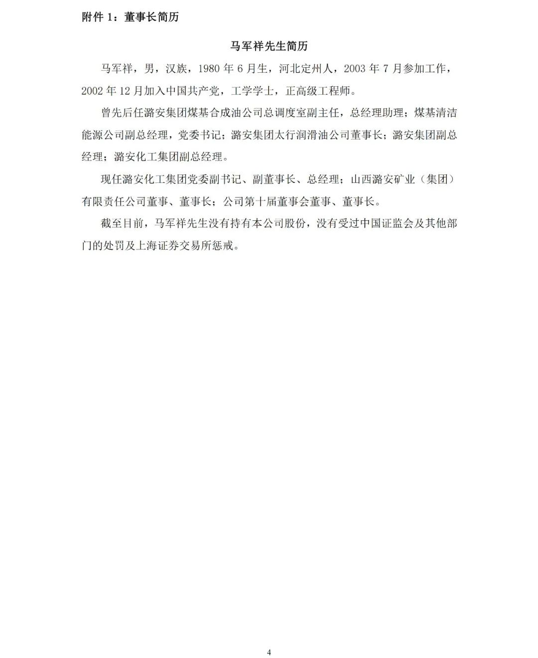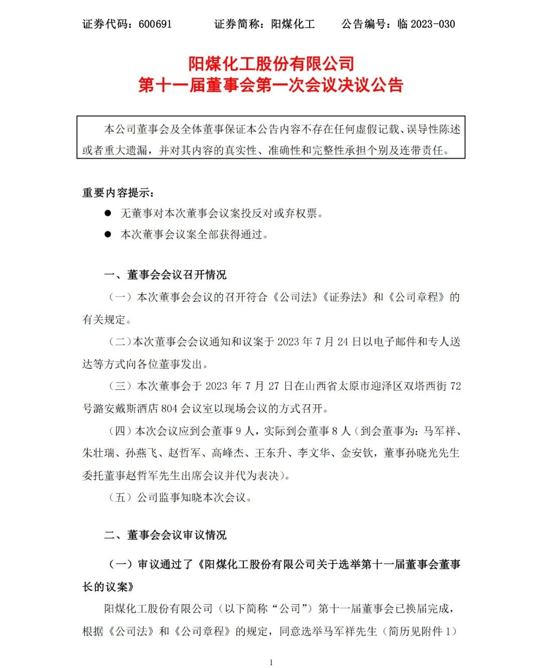 7月28日,阳煤化工股份有限公司发布公告,公司第十一届董事会已换届完成,同意选举马军祥为公司第十一届董事会董事长,同意聘任朱壮瑞为公司总经理,任期至第十一届董事会任期届满。