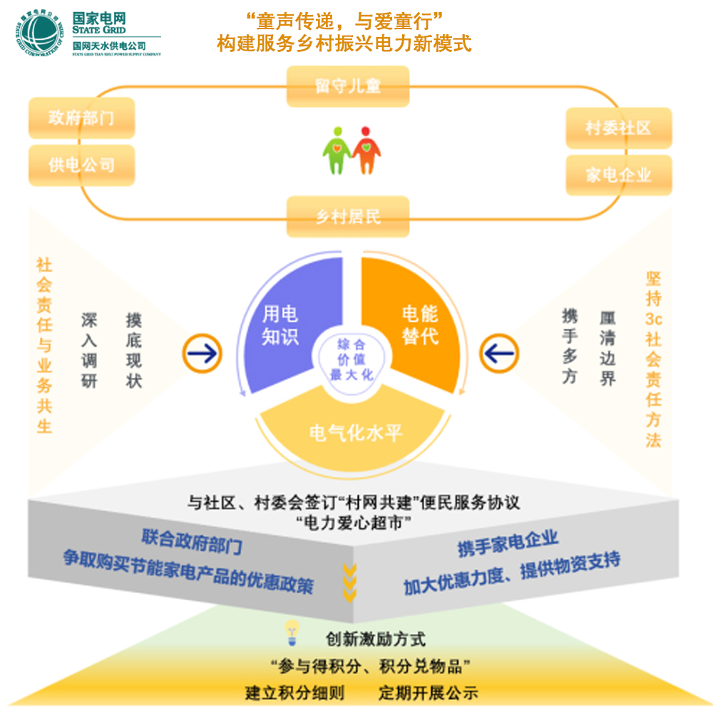 国网甘肃省电力公司天水供电公司: “童声传递,与爱童行”,构建服务乡村振兴电力新模式 国网天水供电公司基于10年来持续开展关爱乡村贫困、残障、留守儿童志愿服务活动中积累的“与爱‘童’行”丰富经验,通过“普及一个儿童、带动一个家庭、拓宽一个渠道”的方式,将单一的、活动化的爱童服务转变为多维的、项目化的社会服务,整合各方服务力量和资源配置,构建“政府部门发动、电网企业推动、社会力量互动”多方协同统筹发力的“童声传递”乡村电气化推广机制,共同寻找服务乡村振兴,助力乡村电气化提升的社会责任路径。