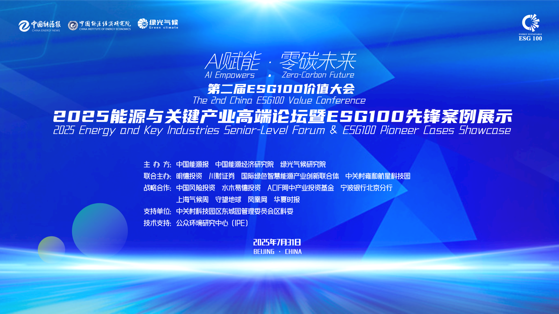 第二届ESG100价值大会——2025能源与关键产业高层论坛暨ESG100案例发布大会将于2025年7月31日在北京东城区中关村雍和航星科技园8号楼举办。本届大会由中国能源报、中国能源经济研究院、绿光气候研究院主办,明德投资、国际绿色能源产业创新联合体、中关村雍和航行科技园联合主办,公众号环境研究中心(IPE)提供技术支持。大会主题为:AI赋能零.碳未来,聚焦“绿色能源、绿色投资、绿色技术、绿色数字经济”,主旨分享环节将邀请行业顶尖专家、院士和优秀企业家代表分享思想、洞见与实践经验;圆桌论坛由资深产业投资机构、产业专家和企业家共同探讨「绿色投资与零碳数智未来」的N种可能;投资路演环节将遴选高匹配度投资机构与绿色技术、循环经济、低碳AI科创项目深度碰撞,融通绿色投资最后一公里。
