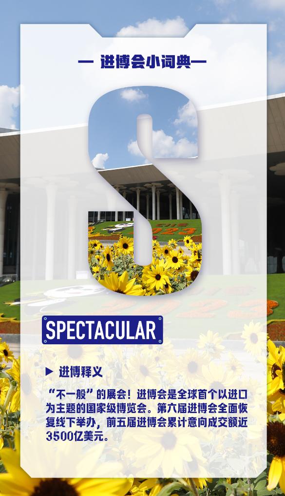 第六届中国国际进口博览会将于11月5日至10日在上海举办,我们的进博会小词典又又又又更新啦!一起学习新知识点,作为“不一般”(Spectacular)的展会,第六届进博会全面恢复线下举办。